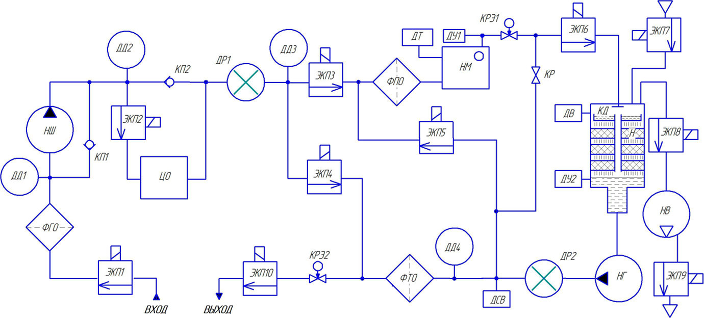 ЭКП1-ЭКП10 - электромагнитные клапаны; ФГО - фильтр грубой очистки; ФПО - фильтр предварительной очистки; ФТО - фильтр тонкой очистки; ДД1-ДД4 - датчики давления; КР - кран шаровый; КРЭ1-КРЭ2 - краны с электроприводом; НШ - насос шестерённый; НВ - насос вакуумный; НГ - насос герметичный; ЦО - центробежный очиститель; ДР1, ДР2 - датчики расхода; ДВ - датчик вакуума; НМ - нагреватель масла; КД - камера дегазационная; ДУ1, ДУ2 - датчики уровня; ДСВ - датчик содержания влаги в масле; ДТ - датчик температуры; Н - наполнитель с развитой поверхностью; КП1, КП2 - клапаны перепускные.
